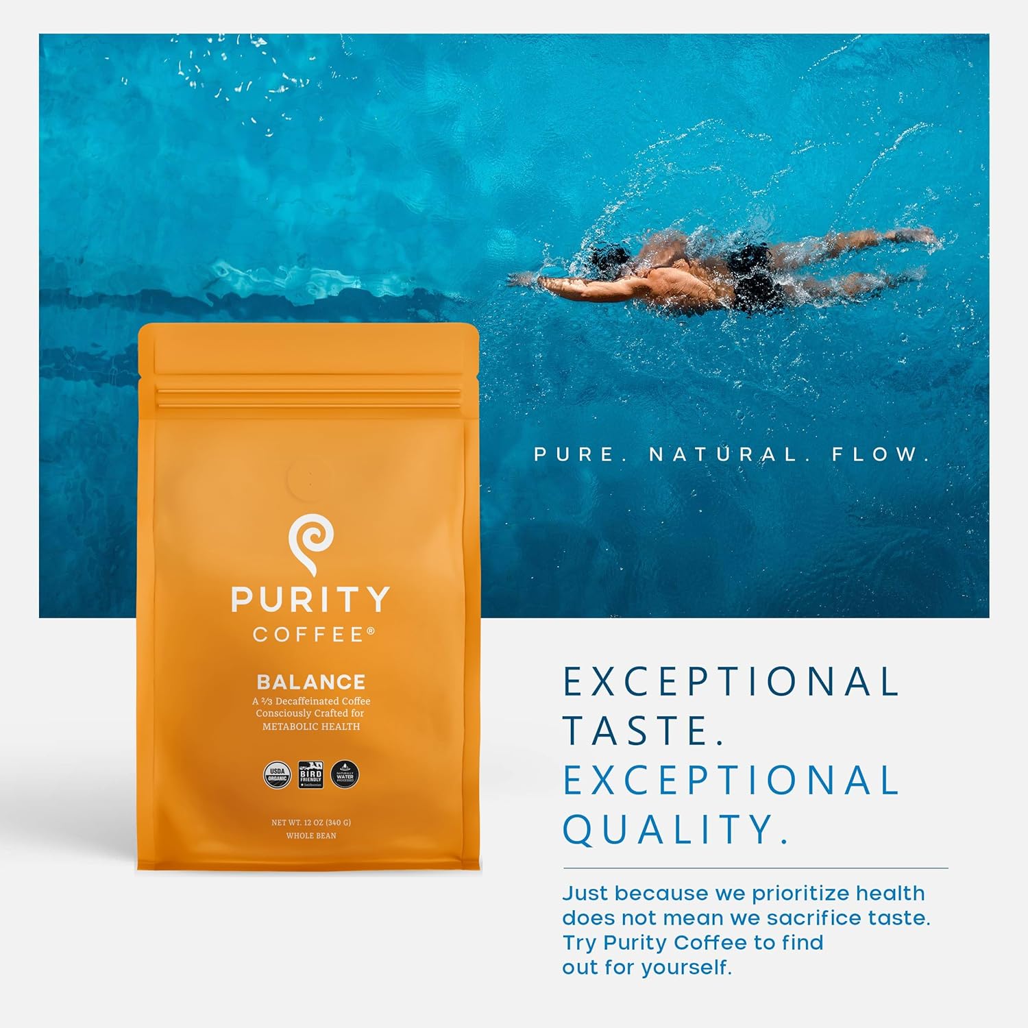 Purity Coffee BALANCE™ ²/₃ decaffeinated medium roast coffee is crafted for those who are mindful of their caffeine intake. Using a precise blend of regular and naturally water-processed decaffeinated beans, this coffee provides high antioxidant activity with less caffeine.
